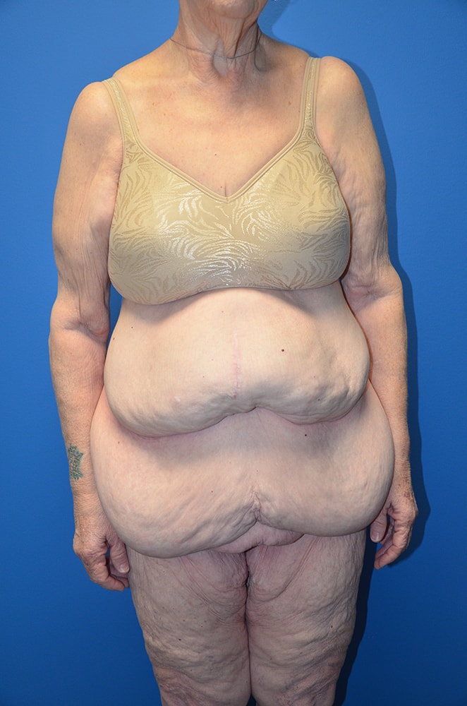 65-year-old woman sustained a 150-pound weight loss. She was left with multiple redundant skin folds and a large lower abdominal wall apron. She presented with significant cosmetic issues and functional problems regarding her skin redundancy. This patient underwent Fleur De-Lis abdominoplasty with an excellent result. She is able to fit normal clothing, her mobility has improved, and her self-confidence is lifted. She is shown three months after surgery.