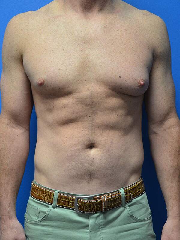 45-year-old male with bilateral gynecomastia. He underwent liposuction of the chest as well as direct excision of gynecomastia tissue with a small periareolar incision. He is shown three months after surgery with excellent contour.