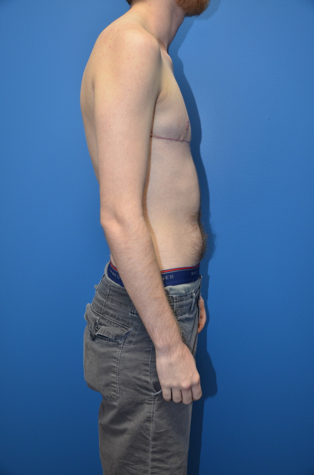 28 year old transgender male underwent double incision top surgery with free nipple grafting. The patient is shown 4 months after surgery and is very pleased with his results.