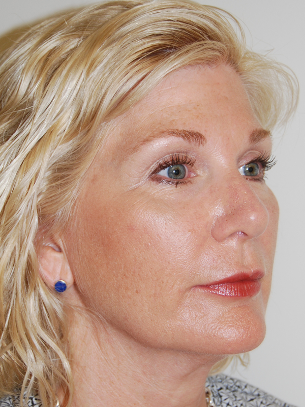 51 year old concerned with a tired appearance of the of the eyes. She is concerned with excess skin of the upper eyelids and dropping of the eye brows. She underwent endoscopic brow lifting and upper lid blepharoplasty. She is shown 4 months after surgery.